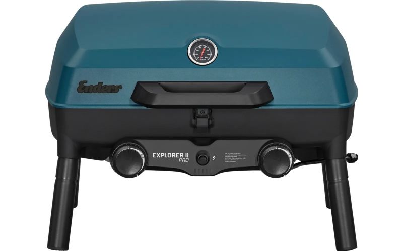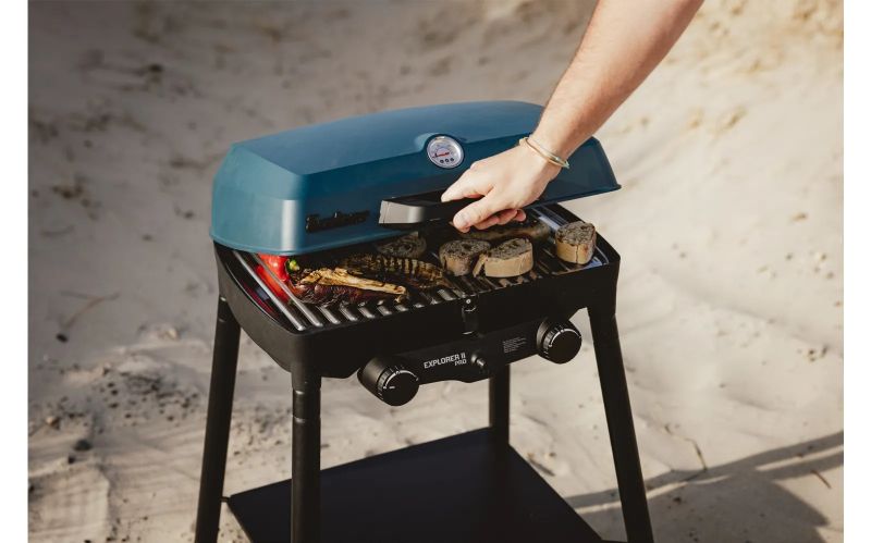 Zwei unabhängig regelbare Edelstahlbrenner mit insgesamt 4,4 kW ermöglichen direktes und indirektes Grillen, Kochen und Backen. Der zweigeteilte Edelstahlrost mit integrierten Flammabdeckungen sorgt für gleichmäßige Hitzeverteilung und einfache Reinigung, während die abnehmbaren Edelstahl-Topfroste sicheres Kochen ermöglichen. Die großvolumige Garhaube mit integriertem Thermometer sowie Gehäuse und Brennkammer aus pulverbeschichtetem Aluguss (Aluminiumguss) stehen für Langlebigkeit bei gleichzeitig geringem Gewicht. Dank steckbarer Beine ist der Grill als Tischgerät oder Standgerät nutzbar.