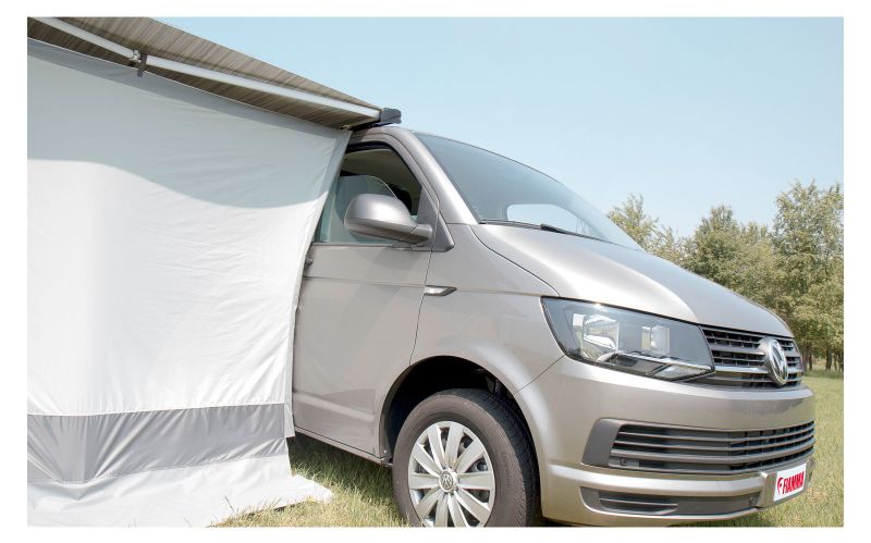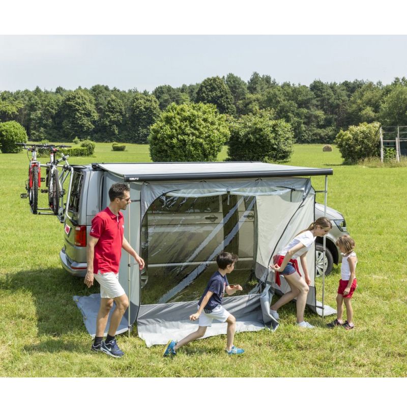 Room Van 270 – der universelle Nutzungsraum für die Markise Fiamma F40 Van. Eine einfache, leichte und effiziente Lösung, um so Ihre Privatsphäre bei kurzen Ausflügen zu erhöhen. Kein Gestänge für den Aufbau erforderlich. Wird ohne jegliches Gestänge an die Schiene der Frontblende und an die Schiene des Gehäusekastens der F40van angebracht. Leicht und dennoch resistent dank dem Ripstop Material. Nimmt in der mitgelieferten Tasche Mega Bag wenig Platz ein.
