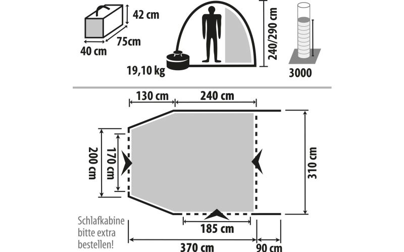 - Zelthaut: 100 % Polyester, Polyurethan beschichtet, Nähte bandversiegelt