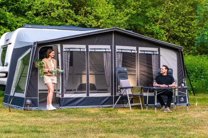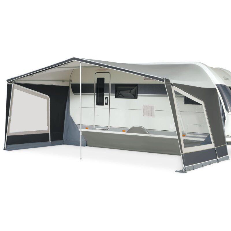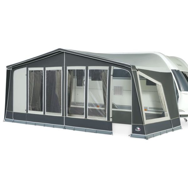 Beide Seitenwände sind mit speziell designten, halbrunden und abschließbaren Gazefenstern ausgestattet. Die Vorderwand hat zwei Türen. So entsteht auf einer Seite eine geräumige Sitzecke. Je nach Lage der Tür des Wohnwagens kann eine Tür geschlossen bleiben. Dieses wunderschöne Sonnendach/Vorzelt wird serienmäßig geliefert mit dem einzigartigen, schnell aufstellbaren, Aluminium EasyGrip Quick System Gestänge oder gegen Aufpreis mit dem neuen superstarken leichtgewichtigen Fibre Tech Plus Gestänge.